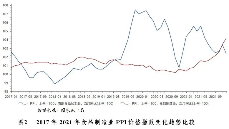 由于成本端原材料、包材、運費齊漲,產業(yè)鏈利潤被擠壓,2021年食品制造業(yè)出廠價格呈現(xiàn)上漲趨勢。國家統(tǒng)計局數(shù)據(jù)顯示,2021年食品制造業(yè)工業(yè)生產者出廠價格指數(shù)為104.20,農副食品制造業(yè)工業(yè)生產者出廠價格指數(shù)為102.4,表明食品價格較2020年同期略有增長。在“疫情”之下,食品作為剛需產品,需求下降不明顯,價格并未受到較大影響。