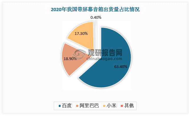 帶屏幕音箱市場中,百度憑借優(yōu)越的人工智能語音技術(shù),出貨量占比最大,2020年為63.4%;其次是阿里巴巴和小米,帶屏幕音箱出貨量占比18.9%、17.3%。